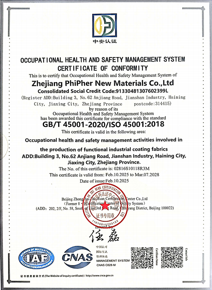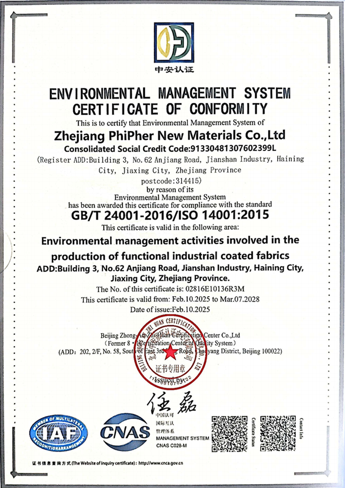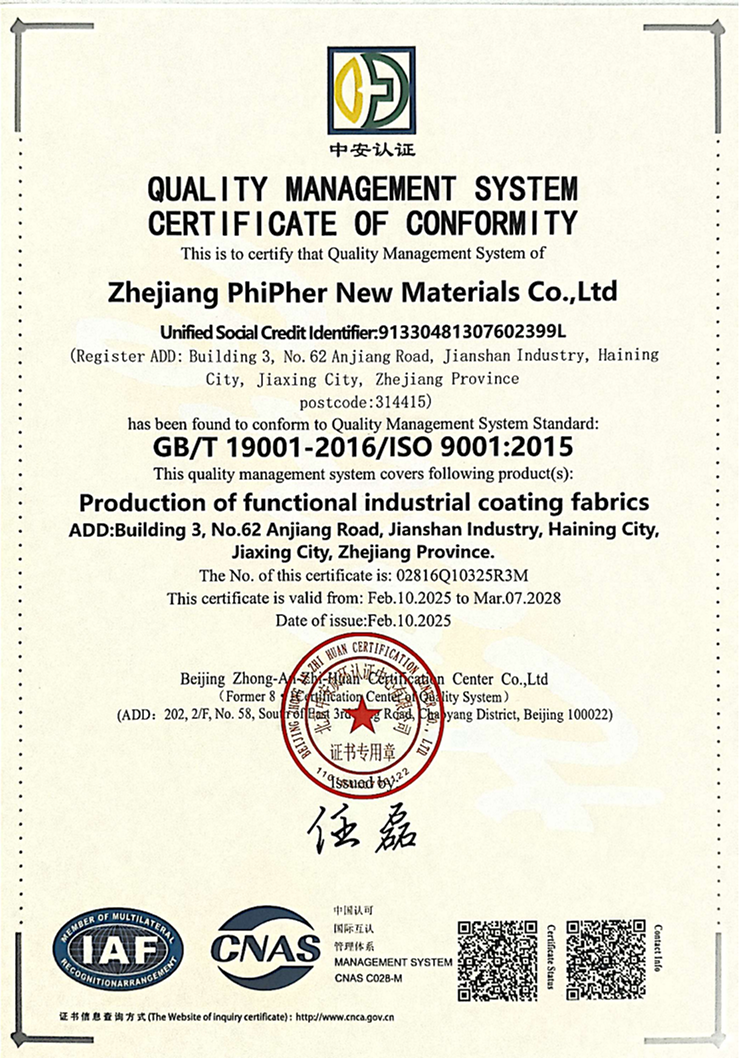 Phipher produce products with excellent physical and chemical properties, good tensile and tearing strength, waterproof performance, self-cleaning ability, corrosion resistance, long service life. Now we are certificated by EN71-3, REACH, ROHS and other international environmental tests. Products now widely used in Truck cover, Side-curtain, Tents, Inflatable materials and Membrane Industries.